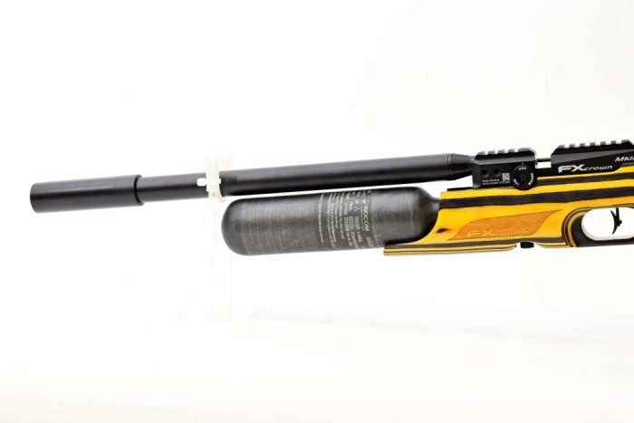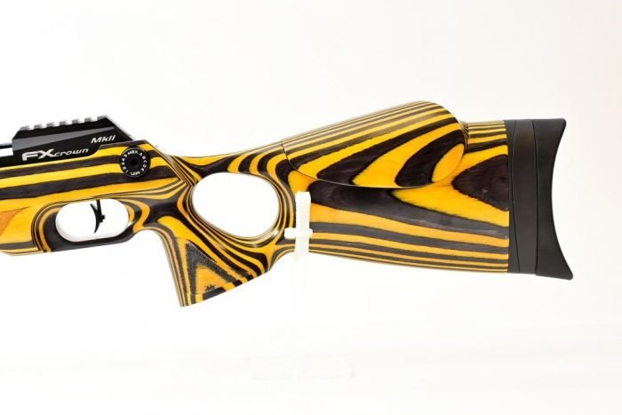 The FX Crown MK2 Compact Yellow Laminate has a Superlight STX (Smooth Twist X) barrel system with changeable liners that feature rifling pressed in from the outside, making for minimal friction and minimal tolerances. Its a very accurate barrel system with the added advantage that twist rates and even calibres can be changed in the flick of a wrist.