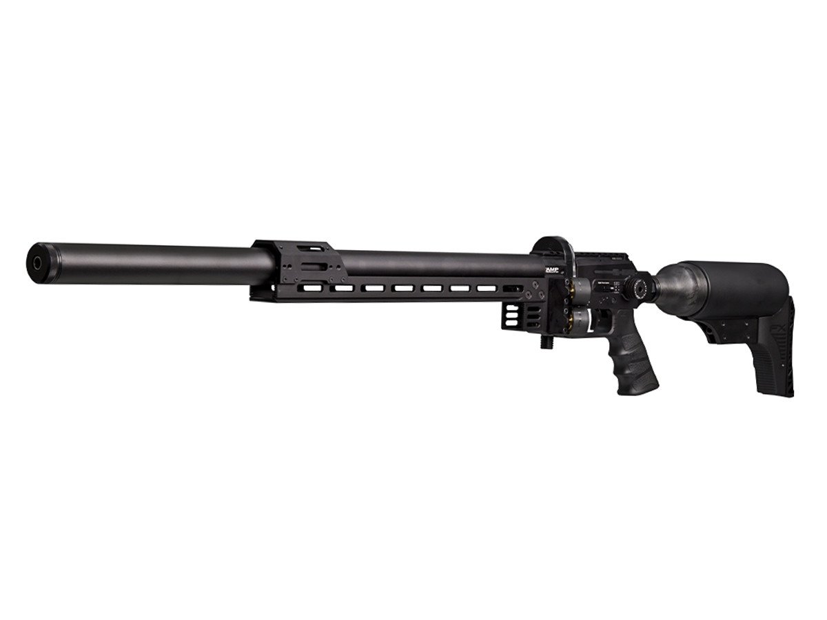 You get an ergonomic textured grip for a slip free hold, plus a molded cover for the bottle that gives you a cheek rest and a ventilated rubber buttpad for enhanced control. You also get quick and simple tuning capabilities with the adjustable hammer spring power wheel and the externally adjustable AMP MKII regulator, and the two stage adjustable match trigger gives you the exact break you need.