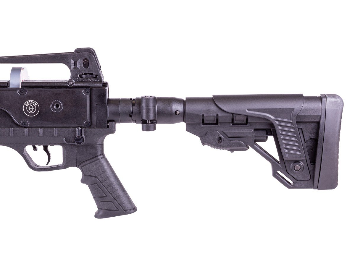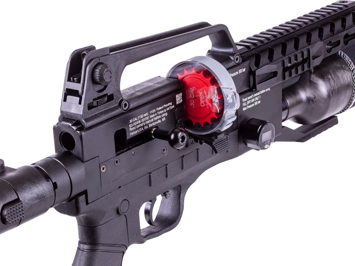 The .22 caliber PCP air rifle can launch pellets to a maximum velocity of 1,120 FPS with 41 FPE (25 cal is rated at 1,020 FPS with 45 FPE and 30 cal is rated at 760 FPS with 59 FPE). That’s more than enough power to ring steel at the range or do some varmint control. It comes with two magazines and works great with the Hatsan SwingLoad High Capacity Magazine for extended mag dumps.