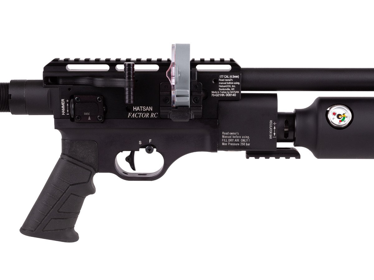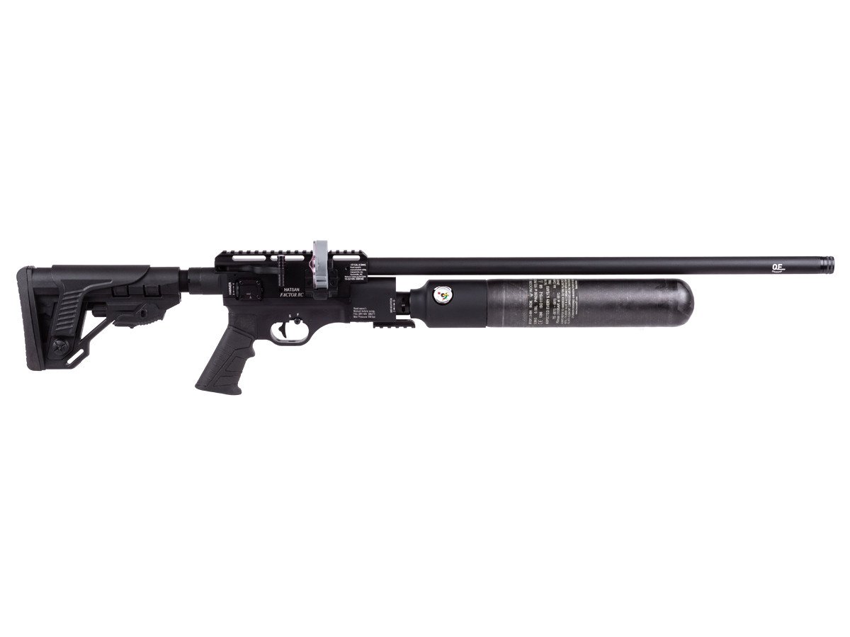 Hatsan Factor RC is an air rifle that gives you tactical features and looks, plus a host of flexible features including an externally adjustable regulator for consistent and repeatable performance. Reaching speeds up to 1010 fps in .177, 1000 fps in .22, and 900 fps in .25, it provides you with plenty of accuracy and power for both target shooting and small game hunting.