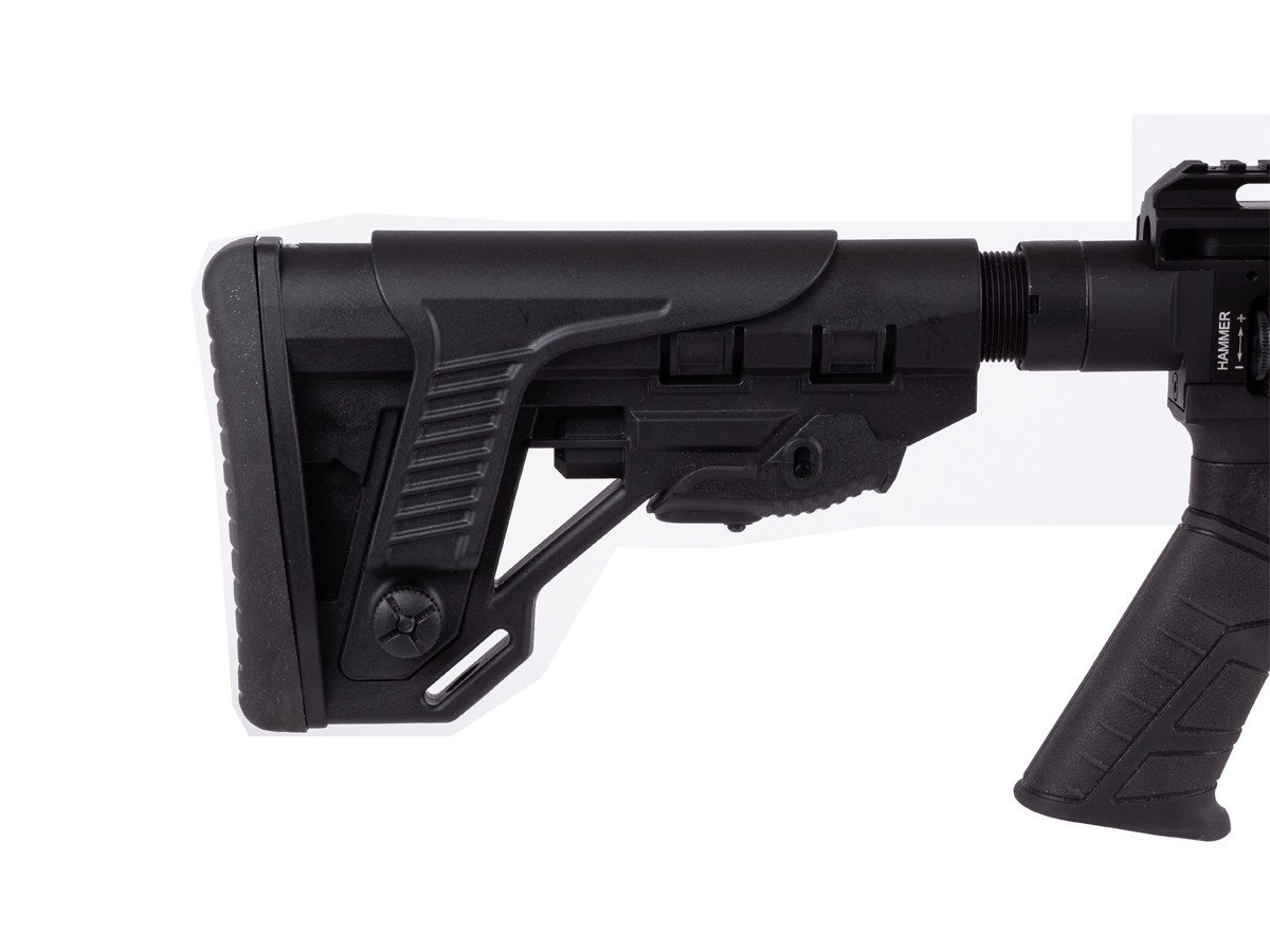 The rifle is equipped with an adjustable stock, allowing shooters of different builds to achieve proper alignment. Additionally, grip positioning is optimized for control and stability.
