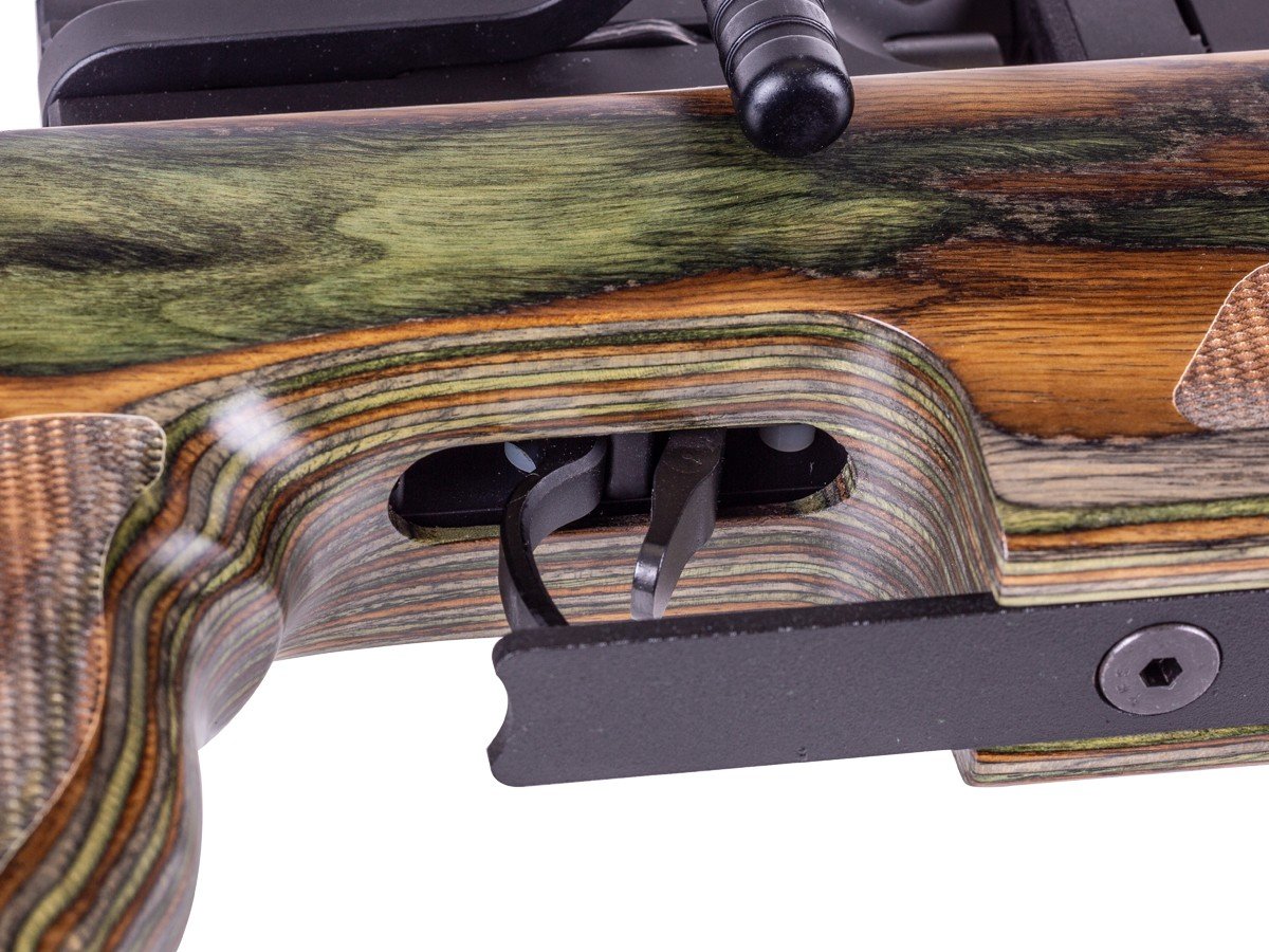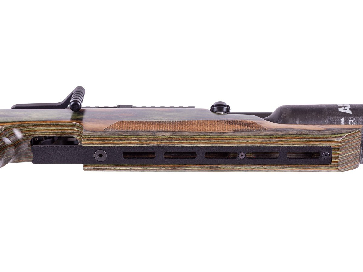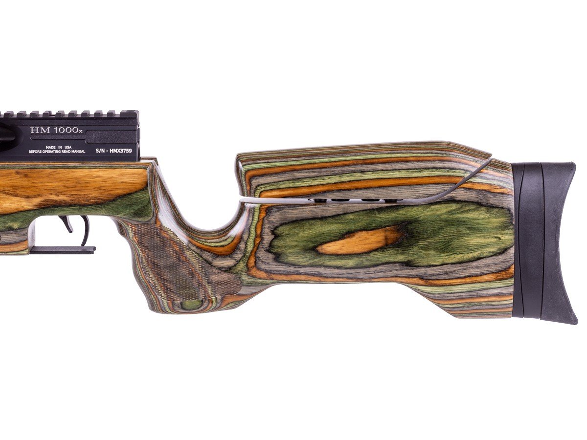 The Rapid Air Worx HM1000X Mini LRT gives you an ergonomic and gorgeous laminated stock, and it’s combined with the same action from the larger airguns in the HM1000X line. You get checkering on the forearm and grip, so your hold won’t slip if there’s moisture, and you get a height adjustable cheek rest and buttpad to customize your experience, plus a flat bottom on the forend for your best benchrest performance.
