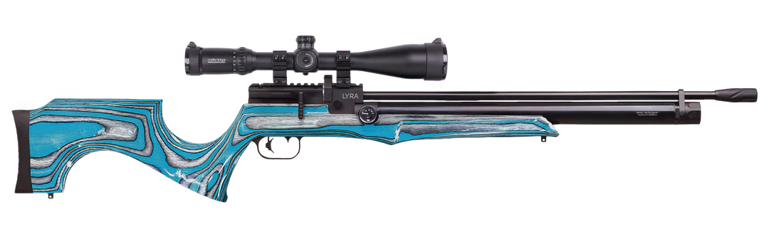 This Reximex Lyra is a sleek and modern PCP air rifle, featuring an ambidextrous light blue laminated stock, side cocking lever and 4-way adjustable trigger. The gun includes 2 x 14-shot magazines and will give approximately 110 shots per fill. The 580mm barrel has been threaded to fit a 1/2″ UNF Sound Moderator.